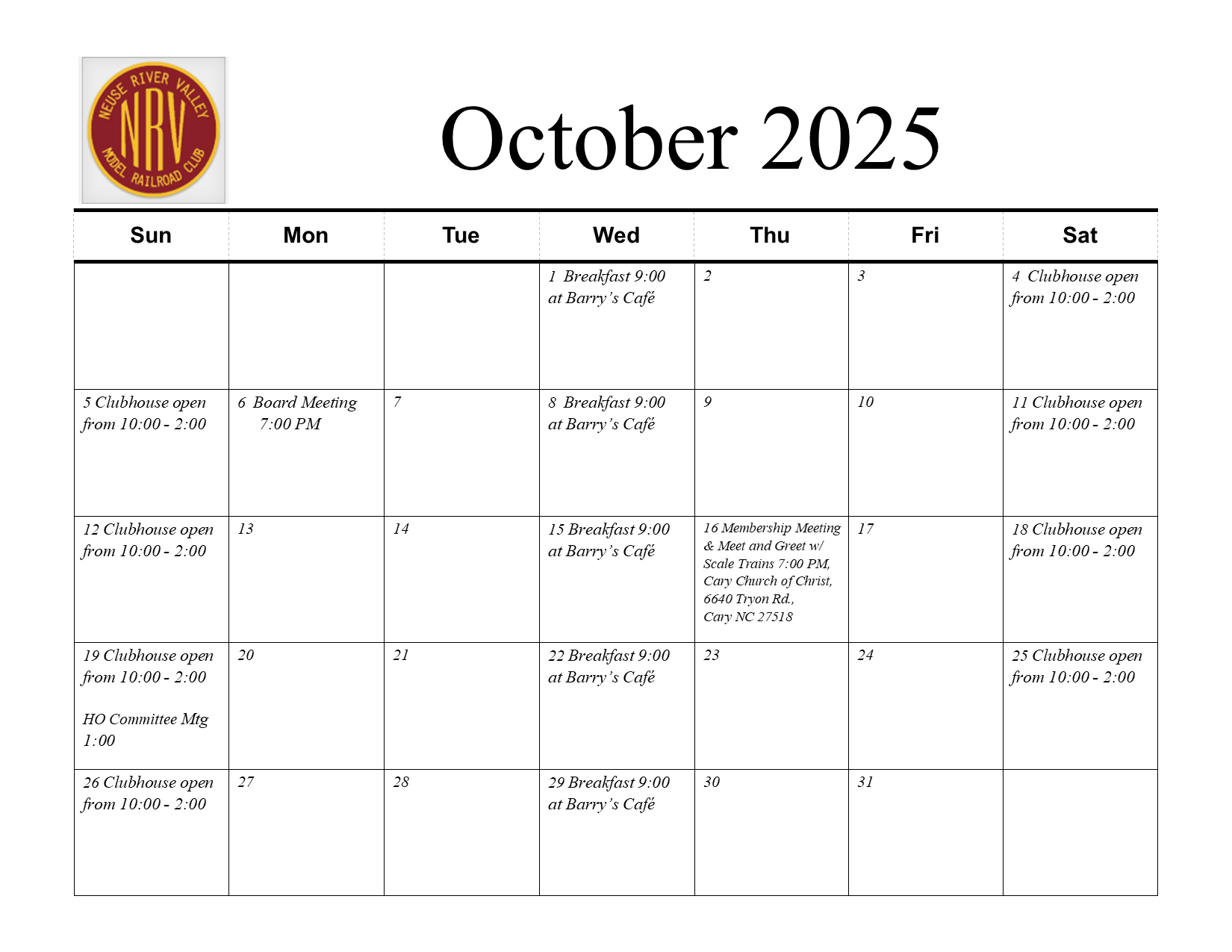 The Neuse River Valley Model Railroad Club clubhouse is open every weekend from 10:00 am – 2:00 pm Saturday and Sunday to members and guests. Additionally, club members usually gather for breakfast on Wednesday mornings at 9:00 am at Barry’s Café located in the Swift Creek Shopping Center. This is at the intersection of Jones Franklin and Tryon Roads in Raleigh. The physical address is 2851 Jones Franklin Road, Raleigh, NC 27606. Please join us if interested.